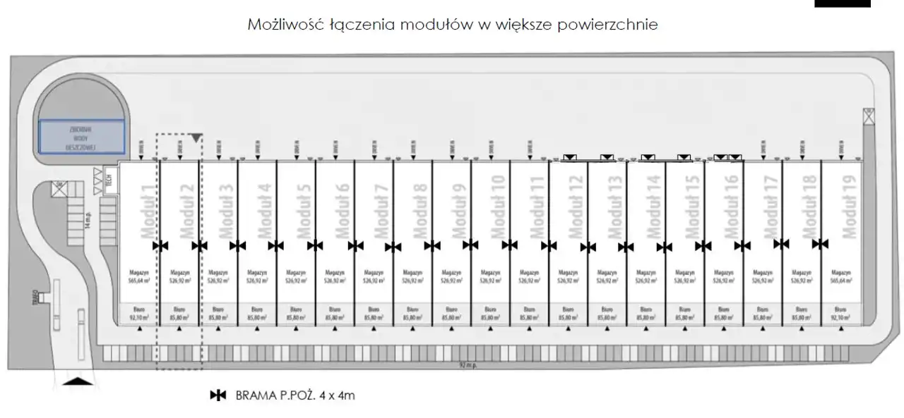Przykładowa oferta pięciu modułów 5x 527 m2 (2635m2) oraz pomieszczeń biurowo-socjalnych 5x 85 m2 (425 m2).