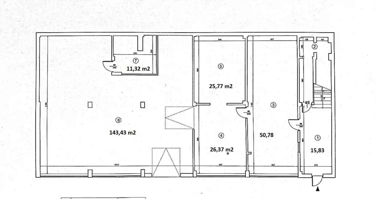 Hala ok. 283 m2 podzielona na mniejsze pomieszczenia (rzut).