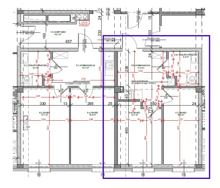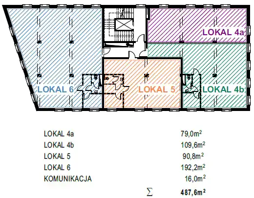 Powierzchnia lokalu 5B - to 39,9 m², w skład, którego wchodzą: biura o powierzchni 12,1 m² i 12,2 m², toaleta 4,3 m² oraz komunikacja – o powierzchni: 11,3 m².