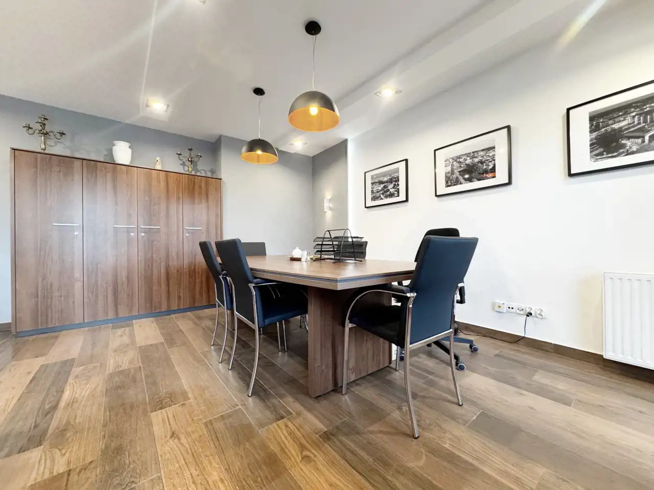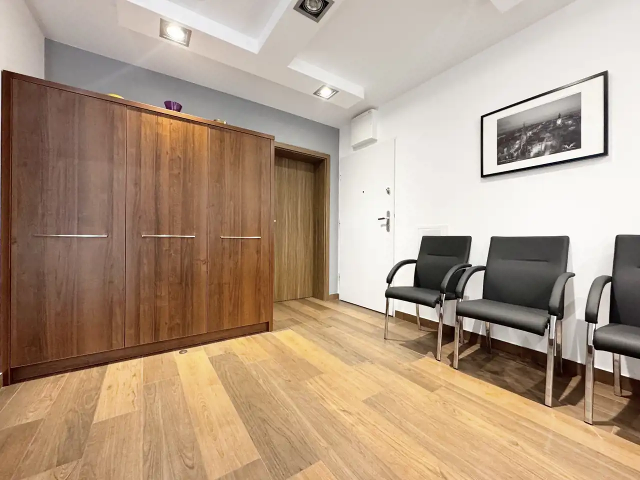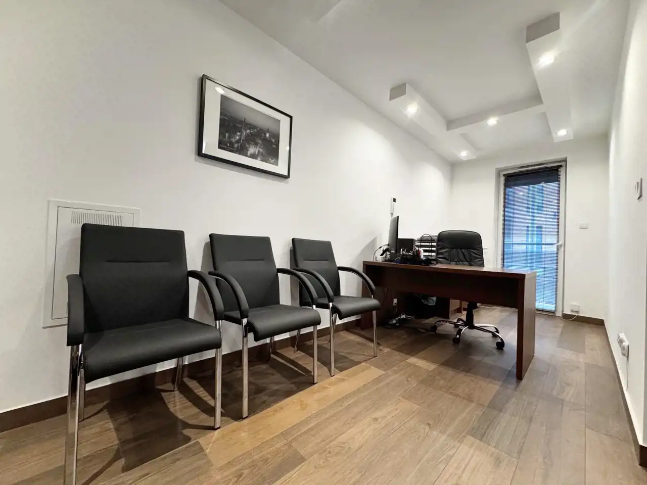 Biuro składa się z poczekalni wraz z recepcją/sekretariatem, łazienki z wydzielonym osobnym WC oraz dwóch gabinetów (26,41m2 i 12,14m2). W mniejszym gabinecie znajduje się ukryty w szafie typu Komandor, niewielki aneks kuchenny.