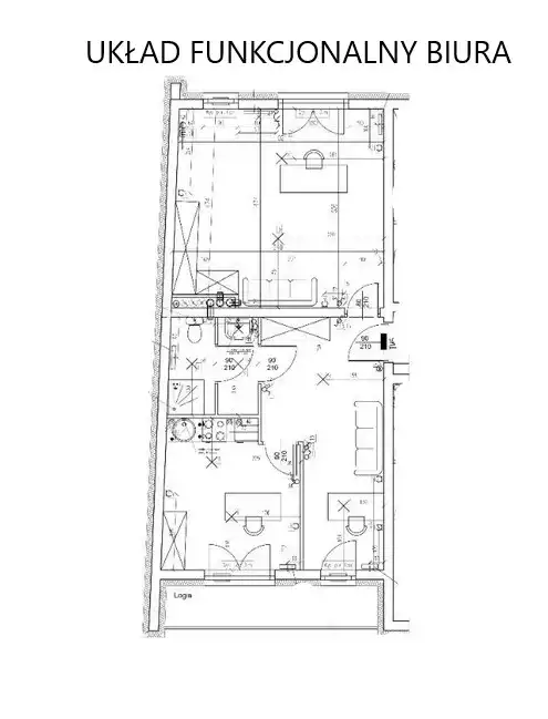 Lokal pełni funkcję biurową, jednakże zmieniając sposób użytkowania lokalu, można zaaranżować go na mieszkanie. Jeden z rzutów przedstawionych w ofercie pokazuje układ biura, drugi z rzutów przedstawia układ mieszkania.