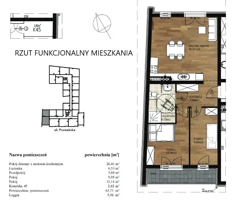 - Charakterystyka mieszkania 63.73 m2, 2 pokoje