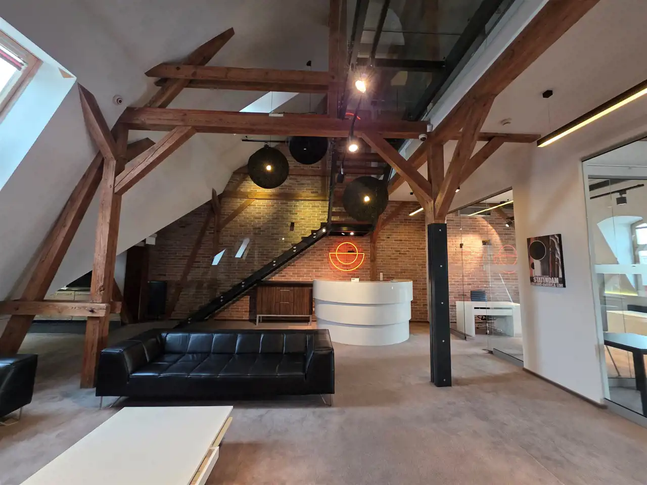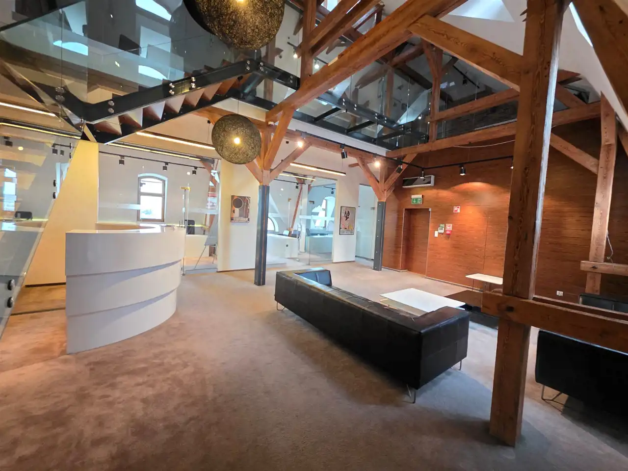 Wysoki standard wykończenia oraz reprezentacyjny charakter budynku podkreślają prestiż prowadzonej działalności.