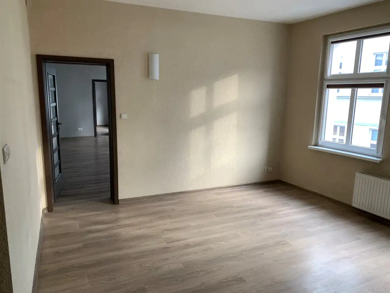 Na podłodze znajdują się panele a na ścianach gładź.