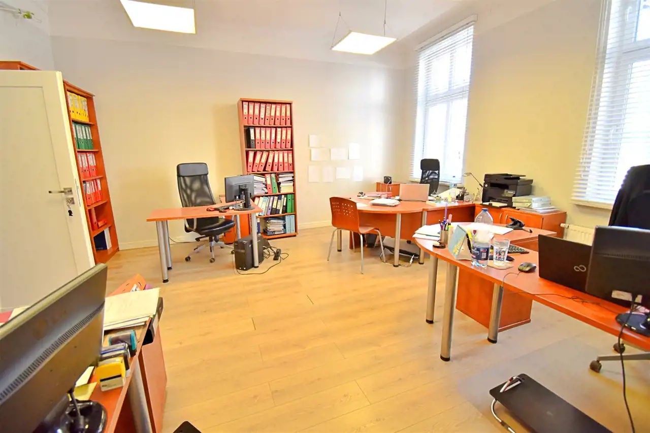 Lokal umiejscowiony jest na parterze budynku ma powierzchnię 126 m2. Składa się z 5 pomieszczeń biurowych, kuchni, łazienki oraz osobnego wc. Rozkładowy układ pomieszczeń