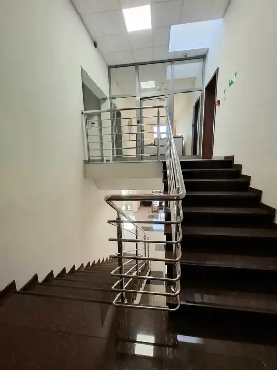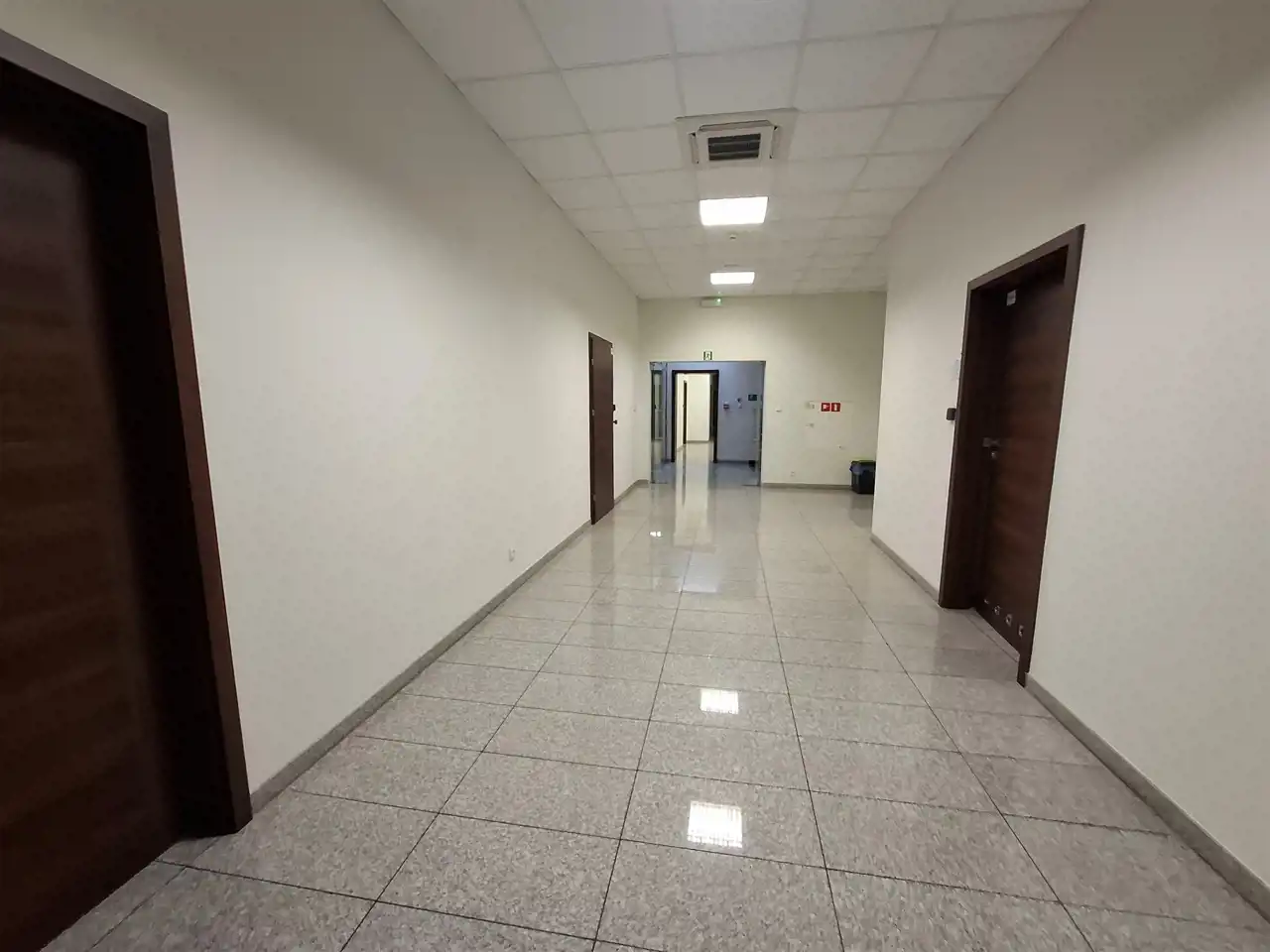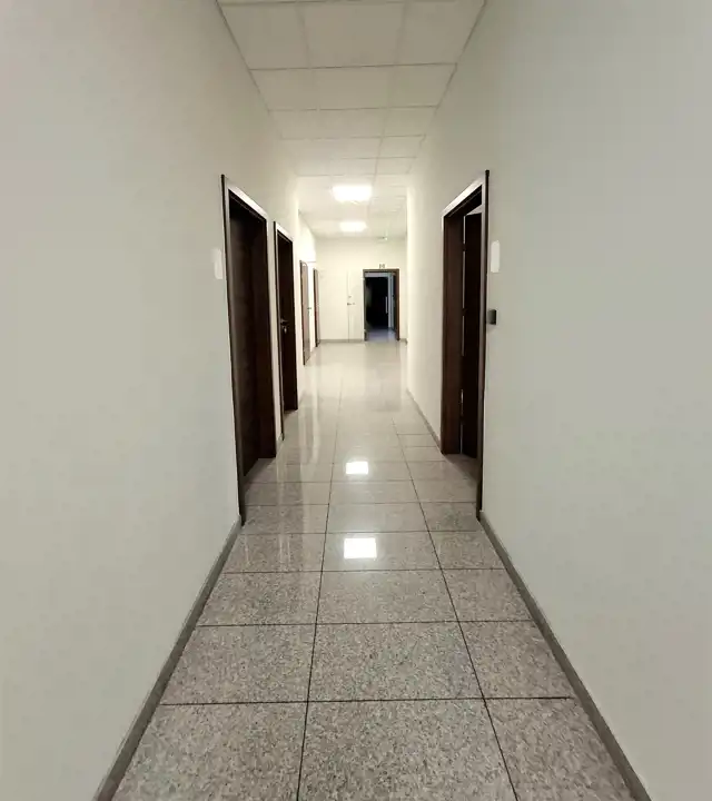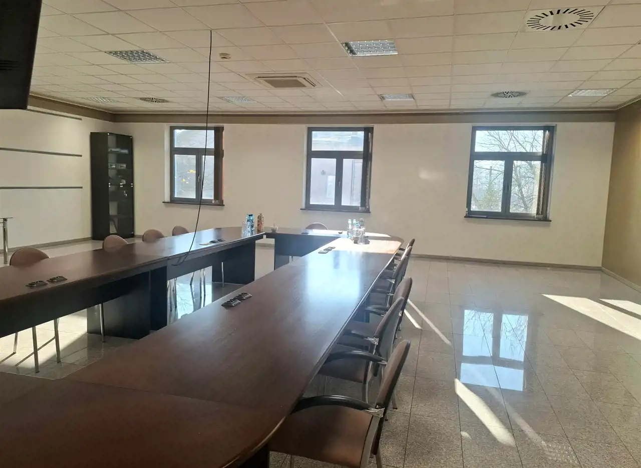 Po stronie prawej i lewej korytarz prowadzi do biur, sali narad 68 m2 i pomieszczenia 66 m2 do wykorzystania stosownie do potrzeb najemcy.