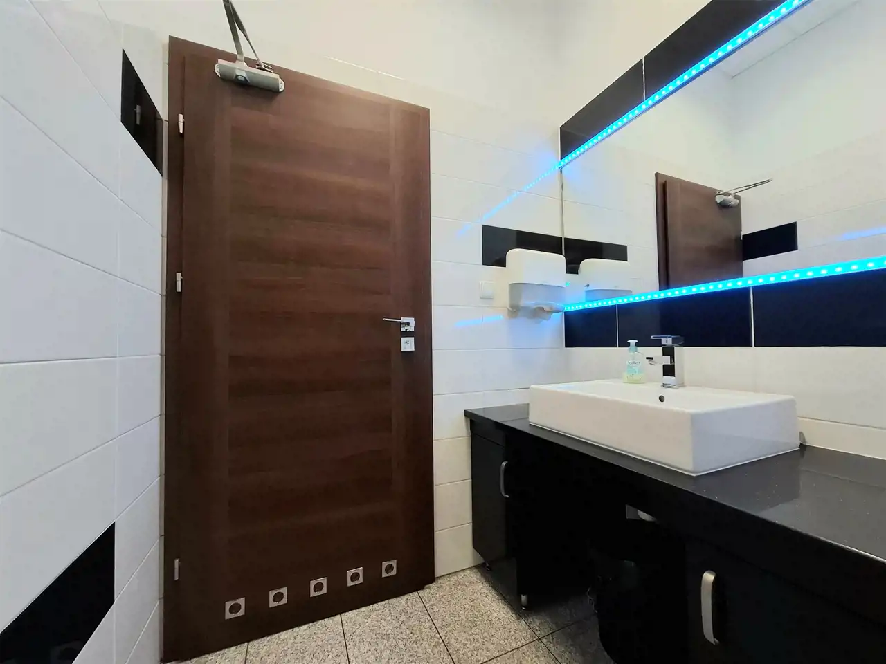 Dla każdej strony jest pomieszczenie socjalne, łazienki damskie i męskie.