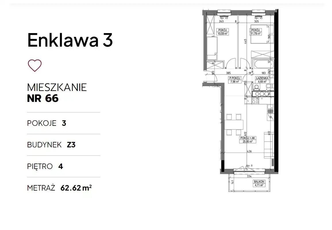 - Charakterystyka mieszkania 62.62 m2, 3 pokoje