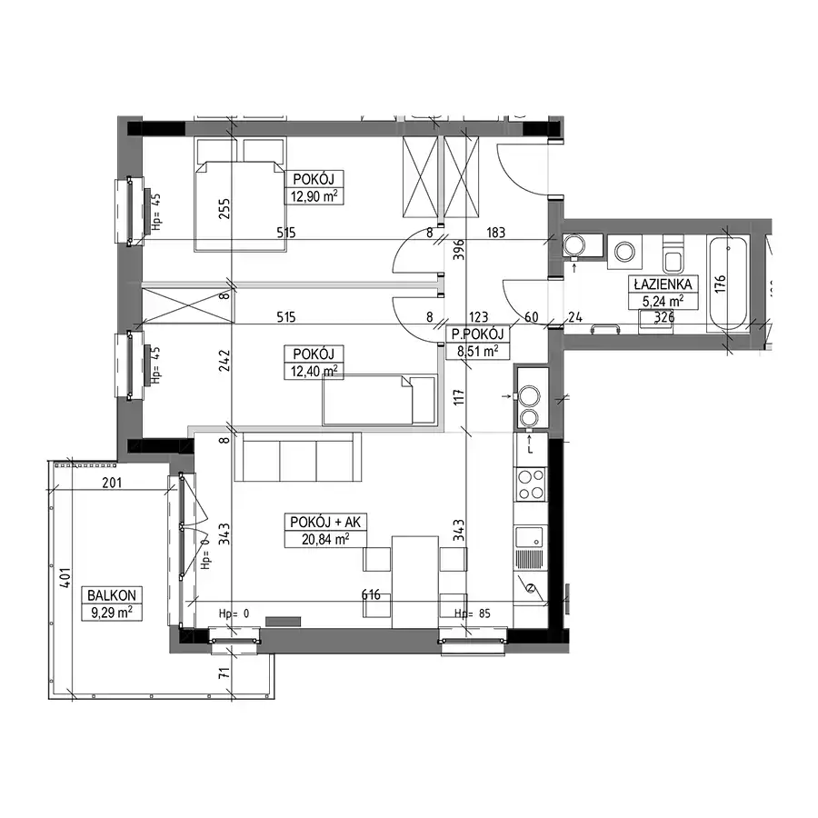 - Charakterystyka mieszkania 61.53 m2, 3 pokoje