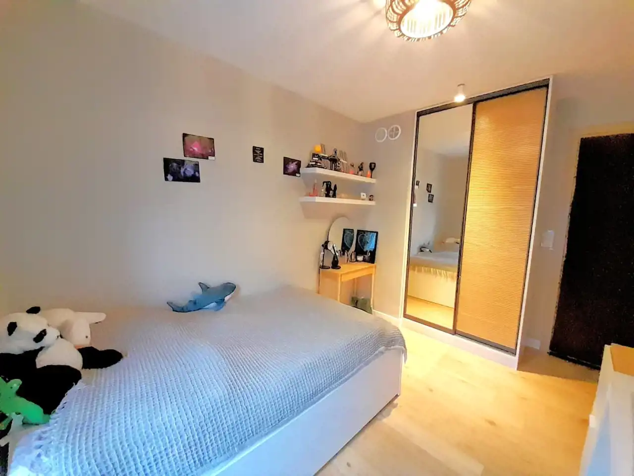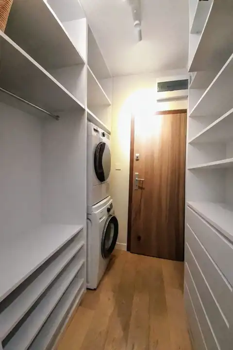 - funkcjonalna garderoba z dużą ilością miejsca do przechowywania rzeczy, wyposażona w pralkę i suszarkę bębnową.