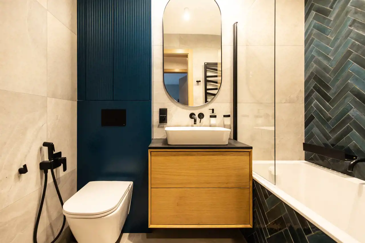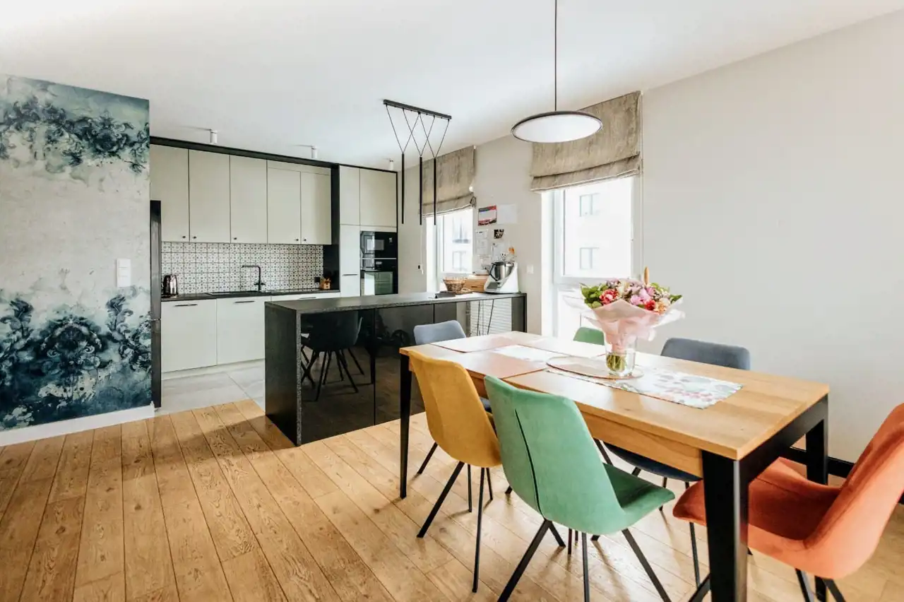 Apartament o łącznej powierzchni 108 m² powstał z połączenia dwóch lokali mieszkalnych, dzięki czemu oferuje przestronność i doskonale przemyślany układ pomieszczeń.