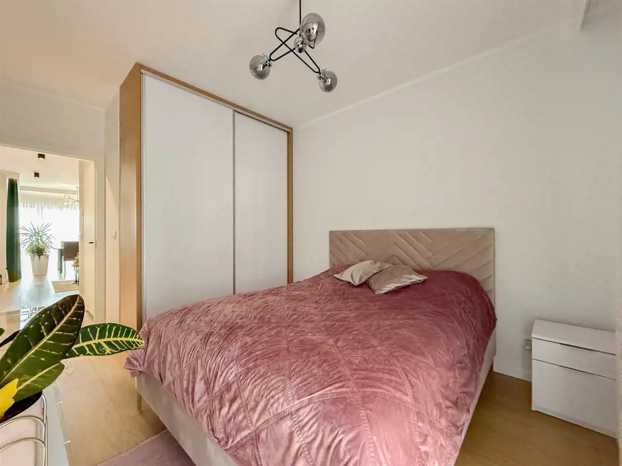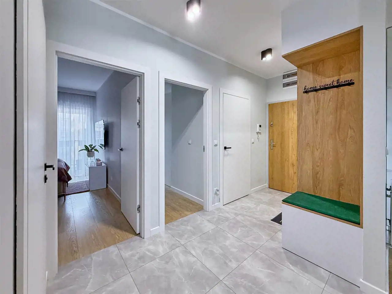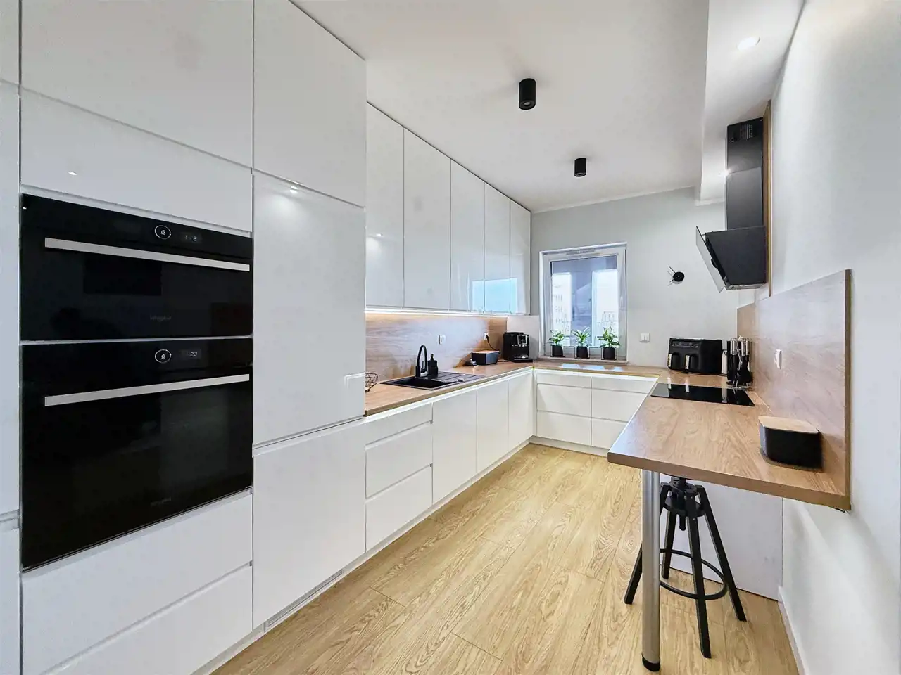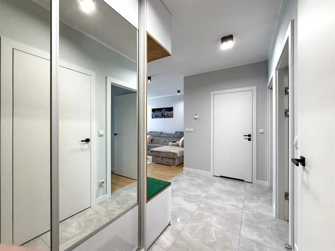 W mieszkaniu znajdują się rolety zewnętrzne i klimatyzacja sterowane z aplikacji, oraz w kuchni i łazience ledy na czujniki ruchu.