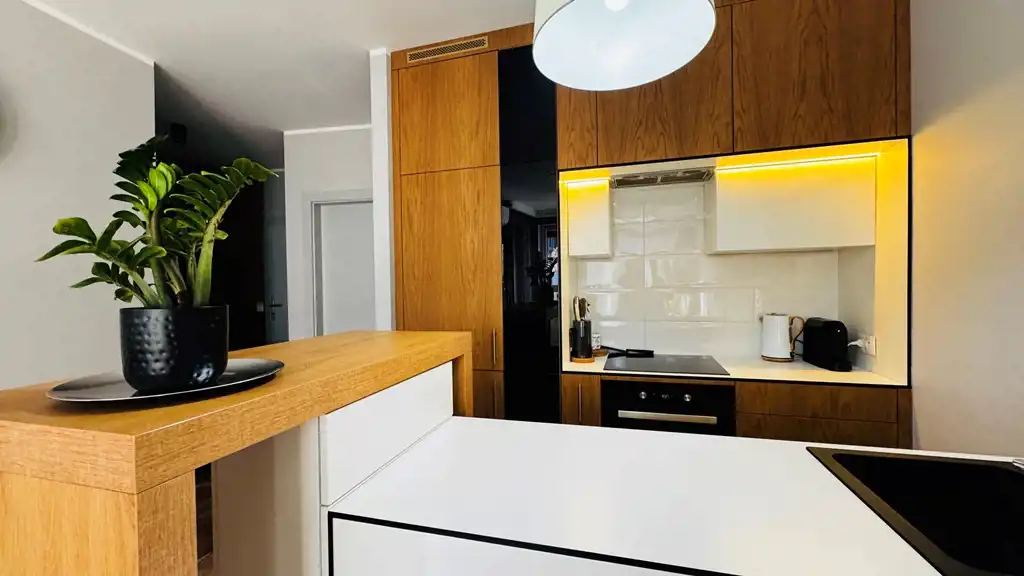 - przestronny salon z aneksem kuchennym (22,03 m²) – kompletnie wyposażonym w meble i sprzęt AGD;