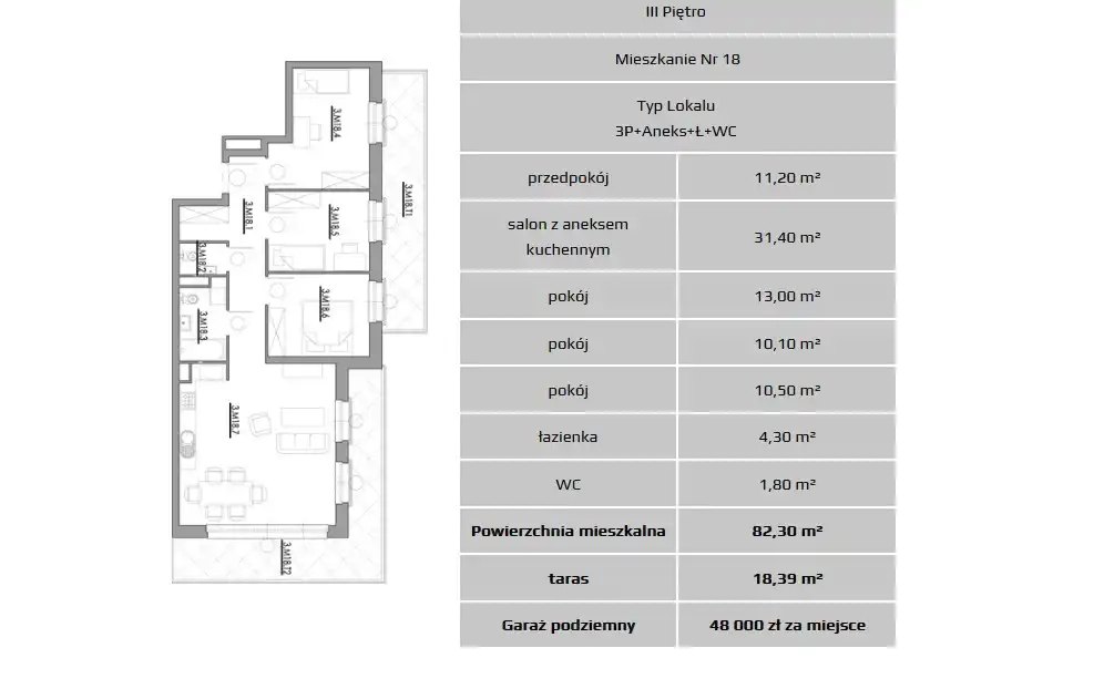 Mieszkanie 4 pokojowe o powierzchni 82,30 m² na 3 piętrze z 2 dużymi tarasami.