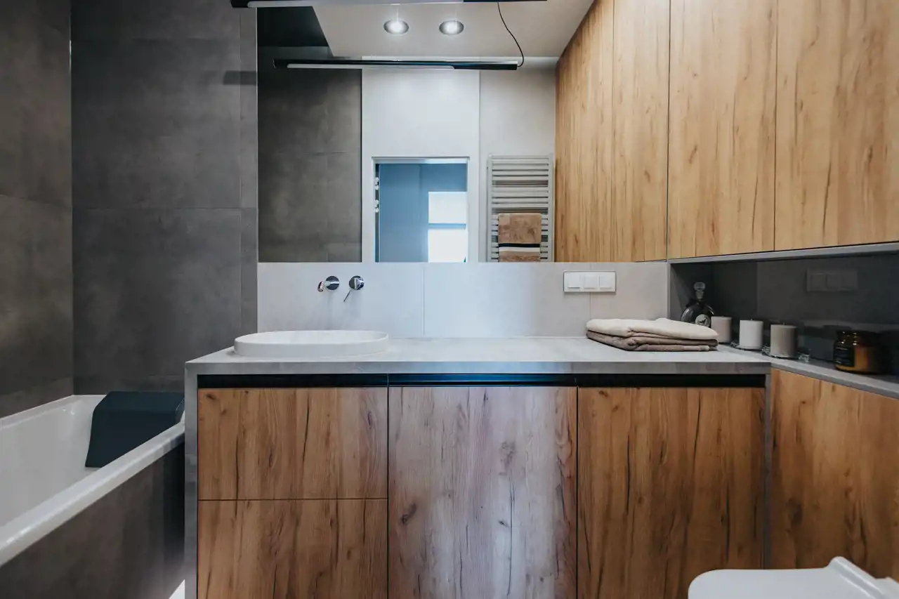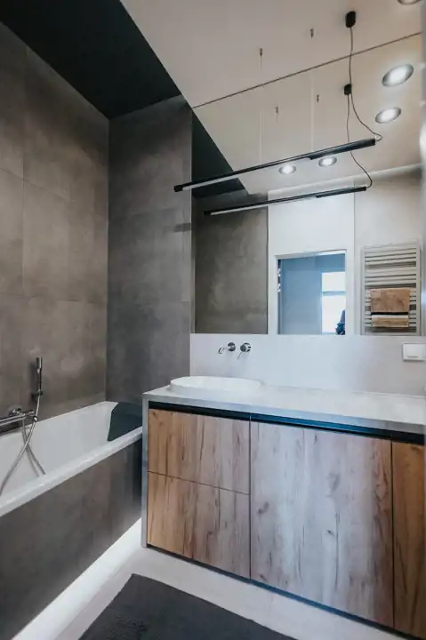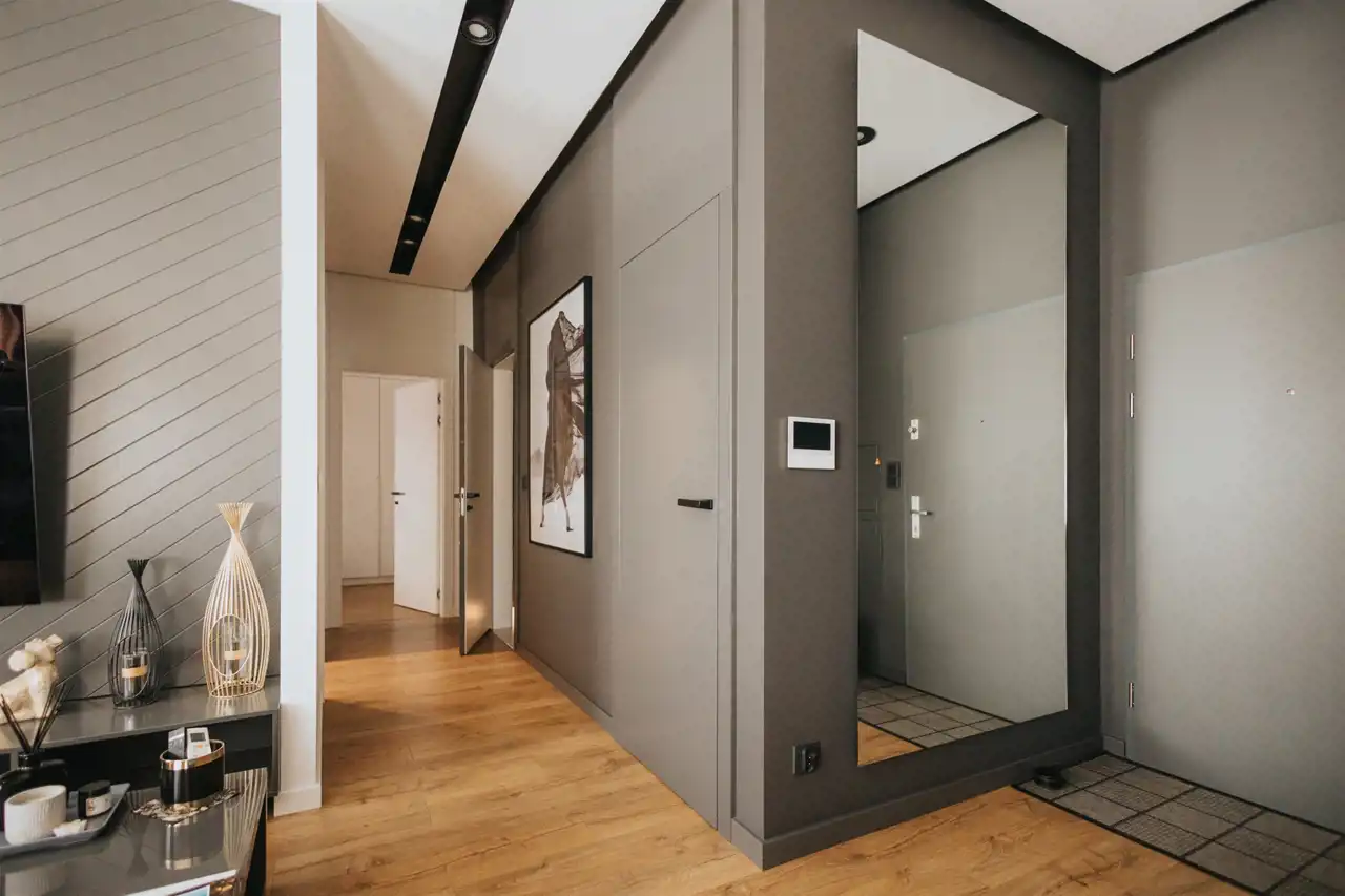 Mieszkanie zostało wykończone z dbałością o każdy detal, z zastosowaniem materiałów najwyższej jakości. Nowoczesny design, połączony z funkcjonalnymi rozwiązaniami, tworzy harmonijną i elegancką przestrzeń.