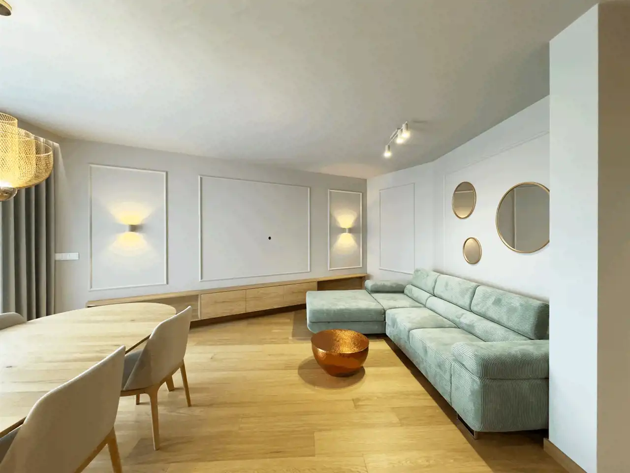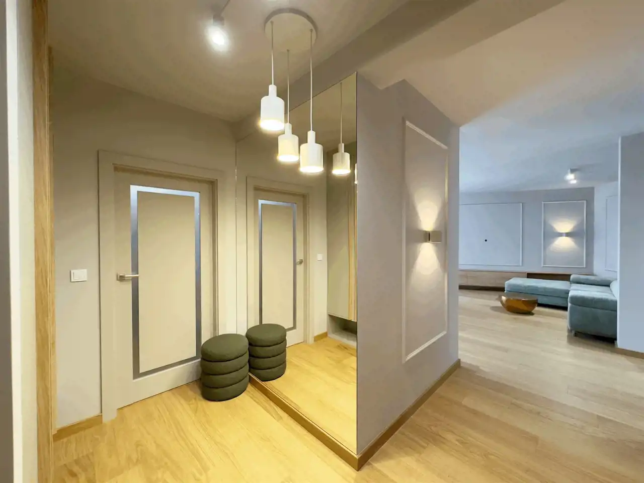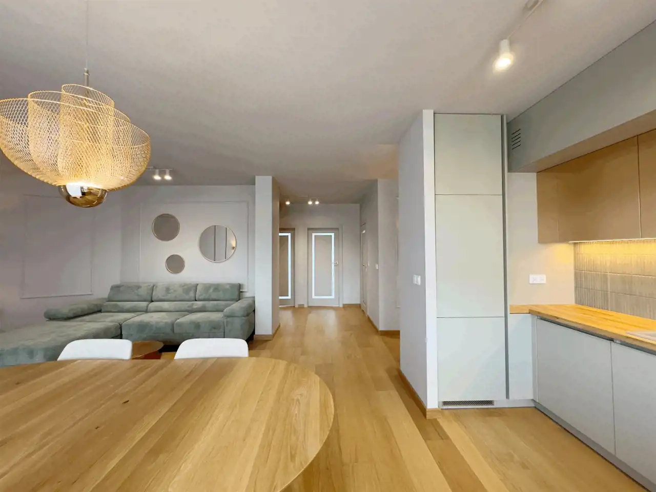 Mieszkanie zostało urządzone w wysokim standardzie, z naciskiem na elegancję i ponadczasowy design. Dominują jasne barwy i naturalne drewno, które nadają wnętrzu lekkości i przytulności. Duże przeszklenia z firanami szytymi na wymiar wpuszczają mnóstwo naturalnego światła, a starannie dobrane oświetlenie dekoracyjne – od designerskich lamp sufitowych po nastrojowe kinkiety – buduje wyjątkowy klimat.
