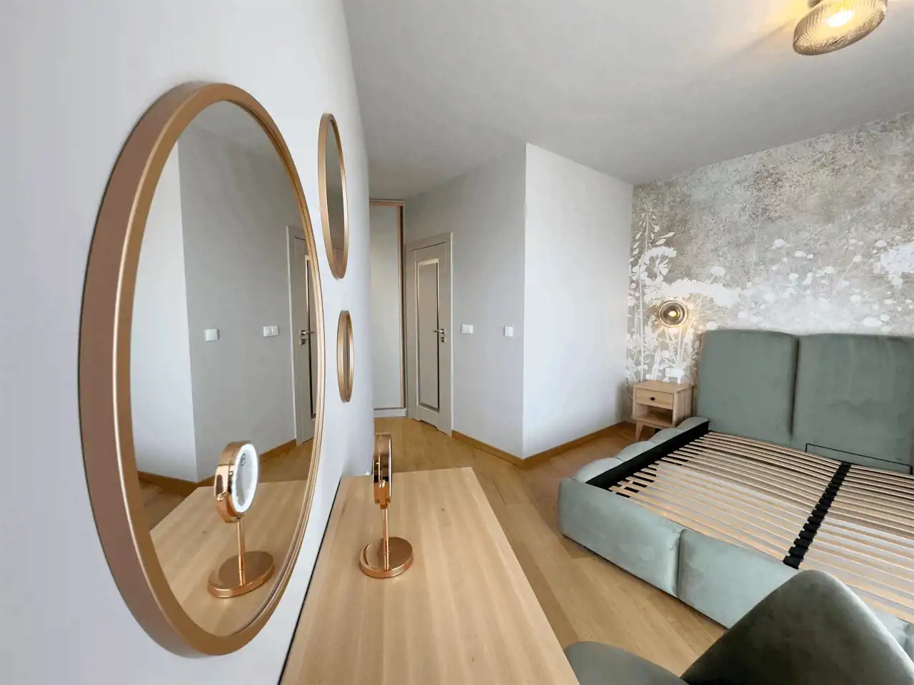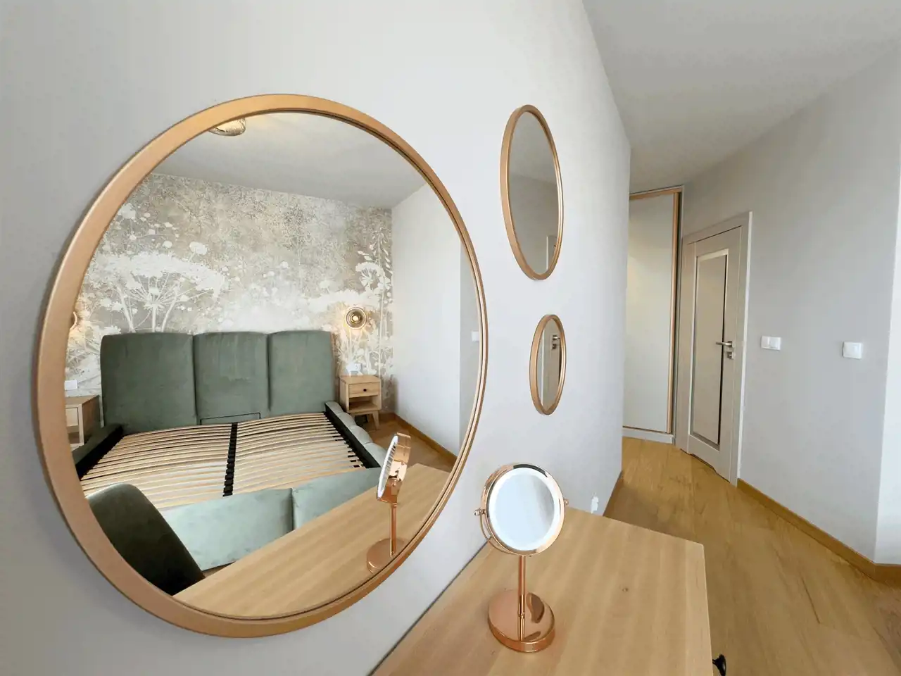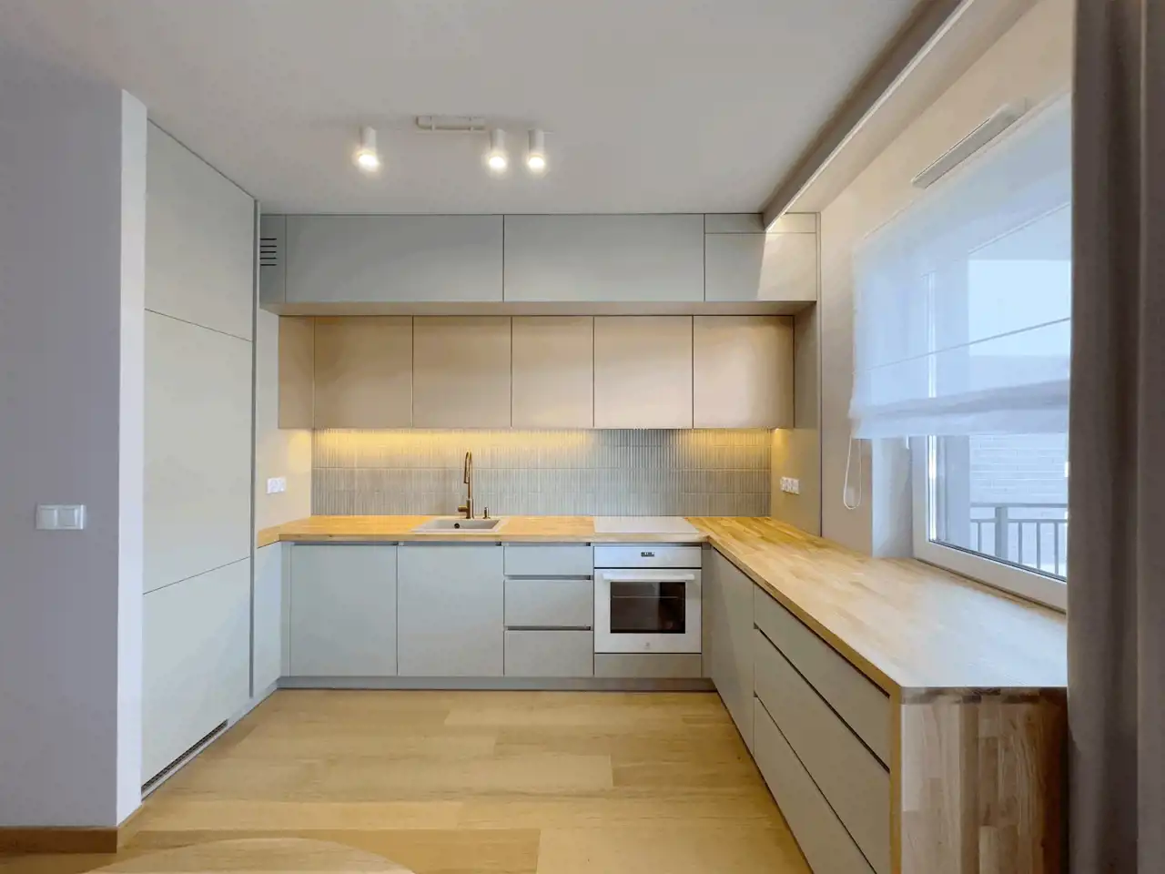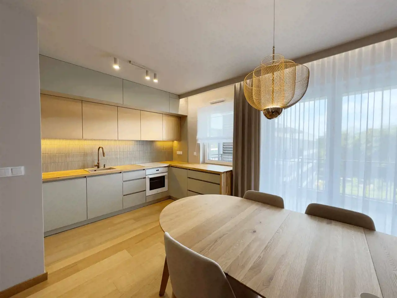 Mieszkanie zostało urządzone w wysokim standardzie, z naciskiem na elegancję i ponadczasowy design. Dominują jasne barwy i naturalne drewno, które nadają wnętrzu lekkości i przytulności. Duże przeszklenia z firanami szytymi na wymiar wpuszczają mnóstwo naturalnego światła, a starannie dobrane oświetlenie dekoracyjne – od designerskich lamp sufitowych po nastrojowe kinkiety – buduje wyjątkowy klimat.
