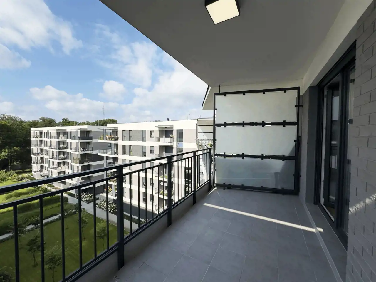 - przestronny balkon w strefie dziennej z widokiem za zielone patio.