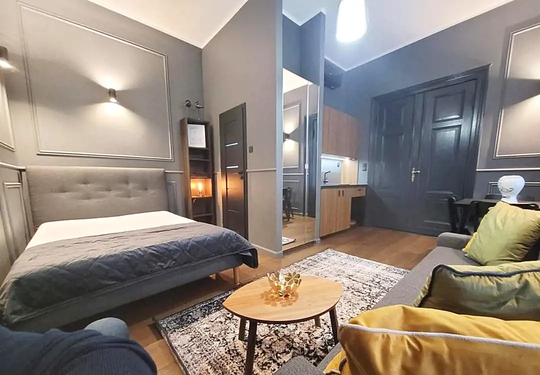Apartament 1 (38 m²) – 2 pokoje w tym jeden z aneksem kuchennym, łazienką.