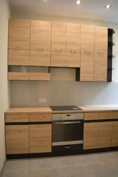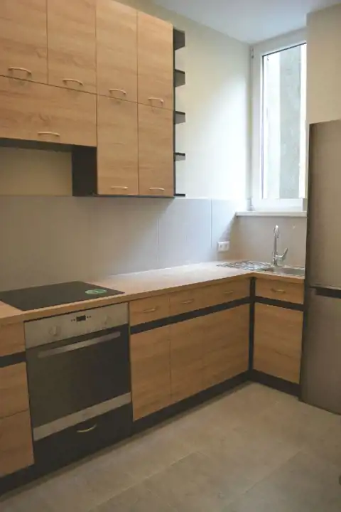 Kuchnia wykończona w zabudowie meblowej- kolor sodoma, zabudowa -zlewozmywak, płyta ceramiczna wbudowana „60”, miejsce na lodówkę.