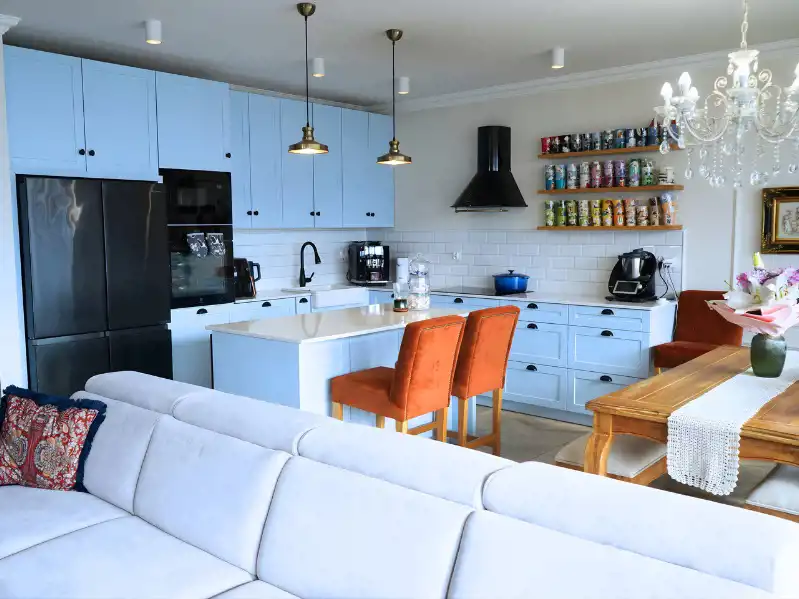 - przestronnego salonu z aneksem kuchennym (ok. 48 m²) – serca mieszkania, idealnego do wspólnego spędzania czasu,