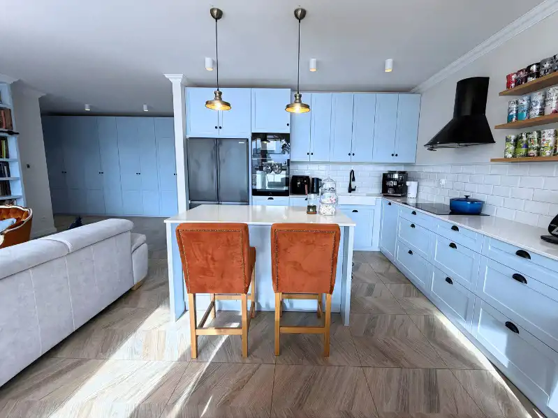 Funkcjonalna kuchnia, z licznymi szufladami i miejscem do przechowywania, bogato wyposażona w sprzęt AGD energooszczędny, wysokiej jakości: lodówka Side by Side, winiarka, zmywarka AEG z szufladą na sztućce, mikrofalówka, piekarnik z funkcją pary, płyta indukcyjna ... Blaty kwarcowo-granitowe.