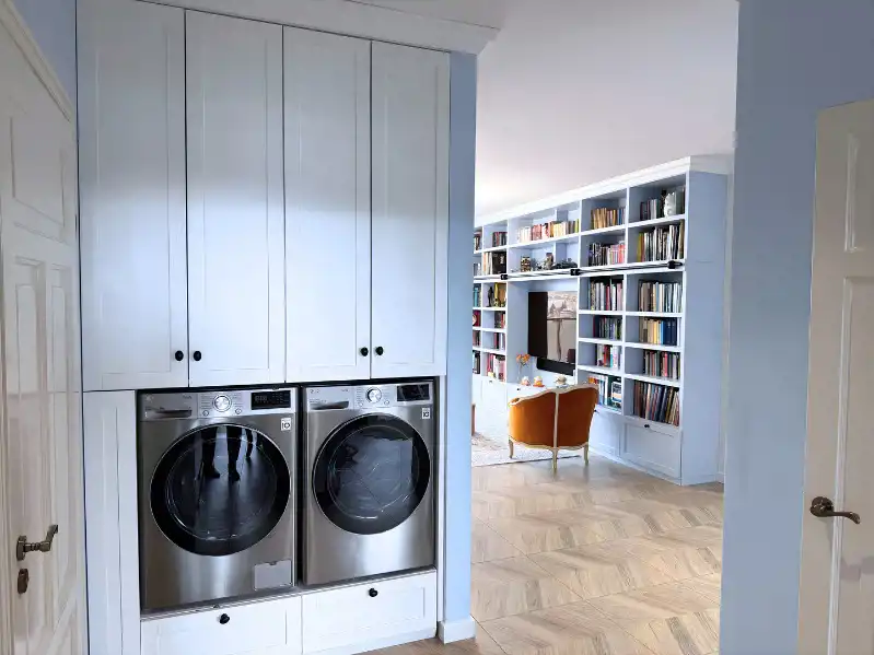 Wnętrze zostało zaprojektowane z dbałością o detale – jasna, ponadczasowa kolorystyka, zabudowy stolarskie na wymiar oraz wysokiej jakości materiały wykończeniowe tworzą elegancką i przytulną przestrzeń. Duże przeszklenia w części dziennej zapewniają doskonałe doświetlenie przez cały dzień. Salon płynnie łączy się z częścią jadalnianą oraz nowoczesnym aneksem kuchennym z wyspą.