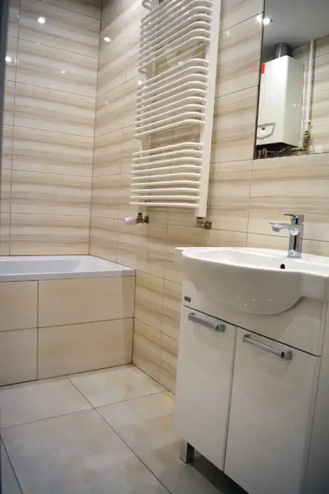 Wymienione zostały wszystkie instalacje wewnętrzne na nowe- elektryczna, gazowa i wodno-kanalizacyjna. Mieszkanie ogrzewane jest ekonomicznym piecem dwufunkcyjnym z nową instalacją CO i grzejnikami. Nowe okna i parapety pcv., drzwi wejściowe antywłamaniowe, wewnętrzne białe ramowe przeszklone. Nowoczesne wykończenie wnętrz ze ściankami, zabudowy, ozdobne wnęki i podwieszane sufity w systemie gkf z oświetleniem led.