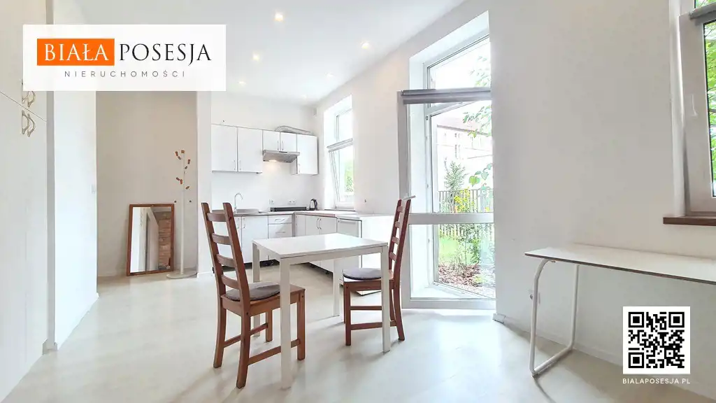 Bezpośrednio z mieszkania, można wyjść oknem drzwiowym na wspólny ogródek.