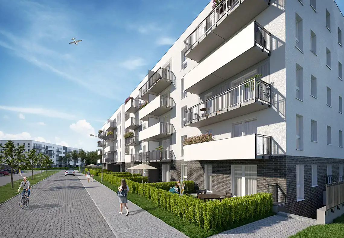 Wszystkie mieszkania na piętrach posiadać będą obszerne balkony, a zaprojektowane na parterze – tarasy wybrukowane kostką oraz zielone ogródki.