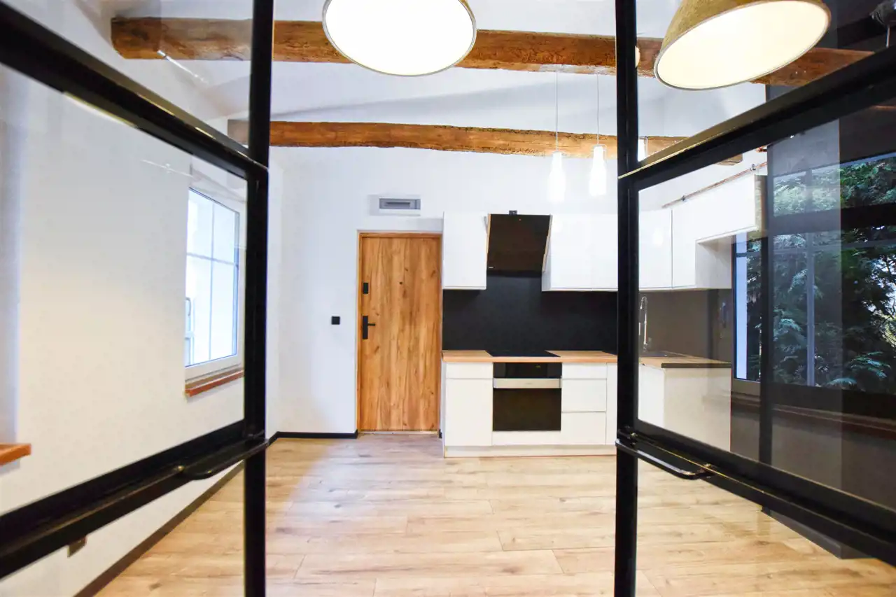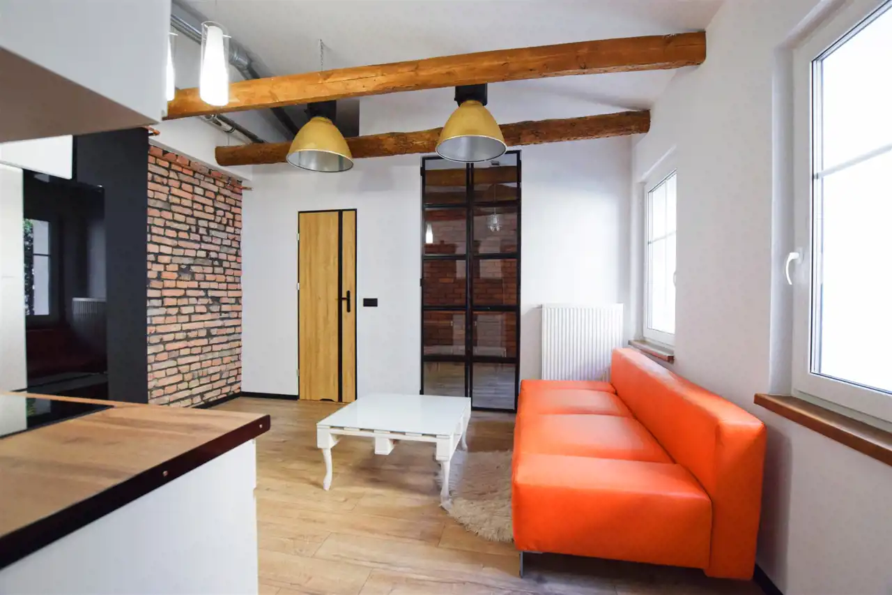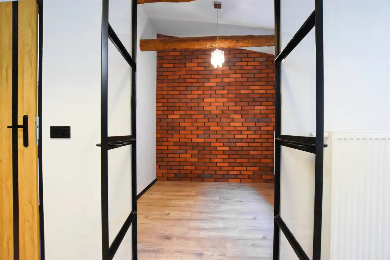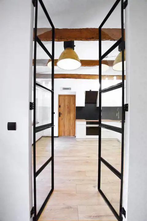 Mieszkanie utrzymane w spójnej stylistyce o charakterze industrialnym. Salon z aneksem kuchennym zachwyca asymetrycznym sufitem z dekoracyjnymi belkami oraz dopasowanym oświetleniem. Ponadto uwagę przyciągają rozpościerające się po sam sufit przeszkolone dwuskrzydłowe drzwi do sypialni.