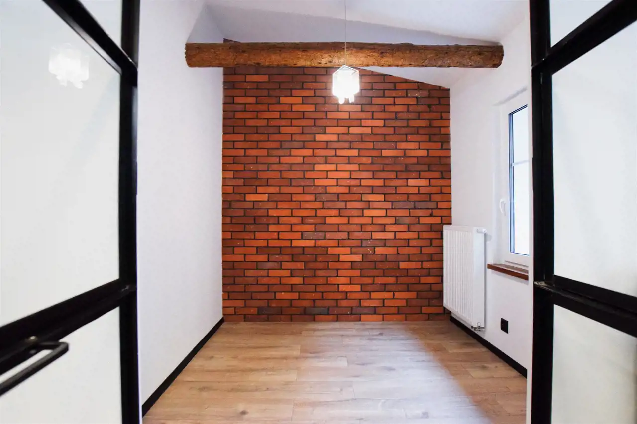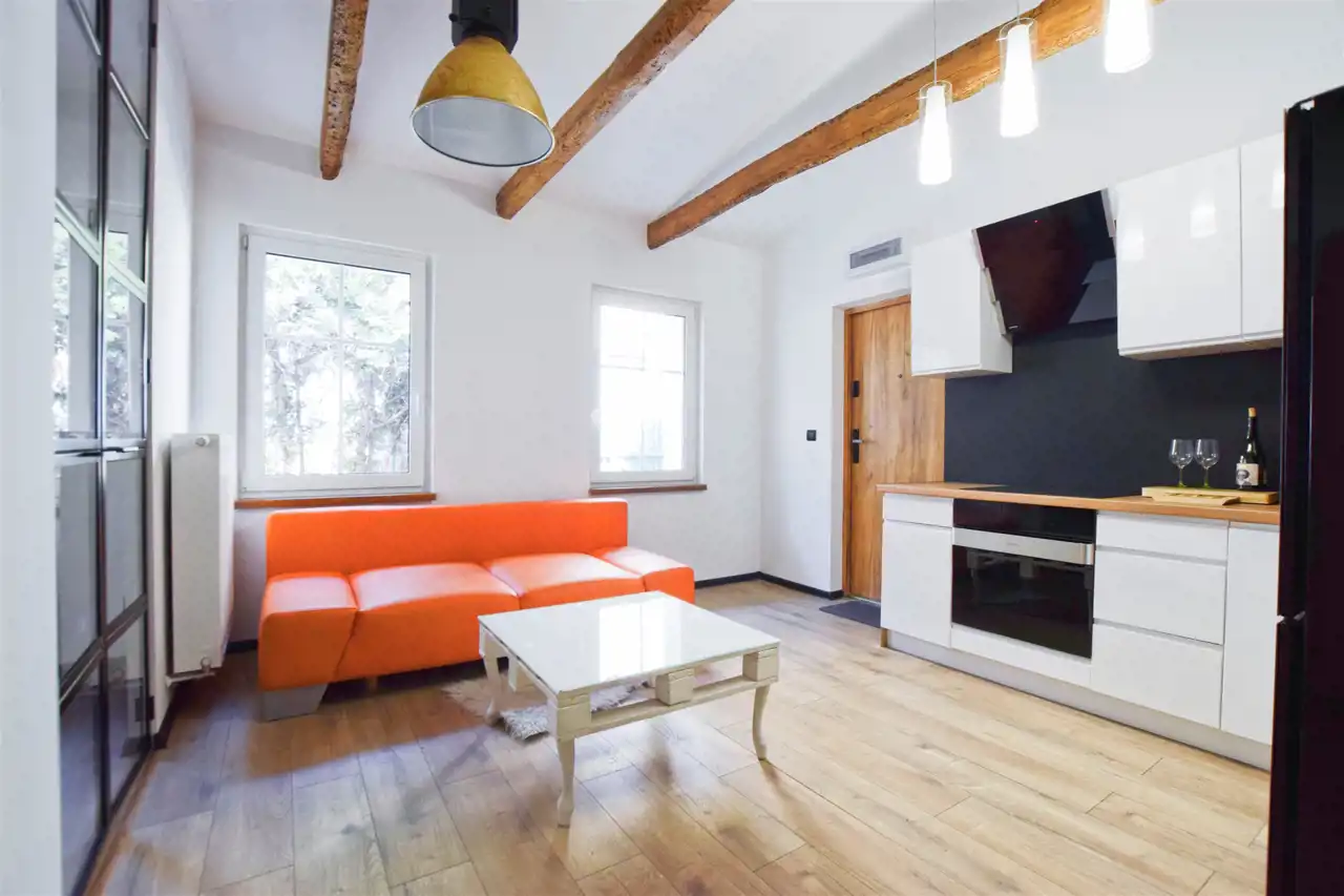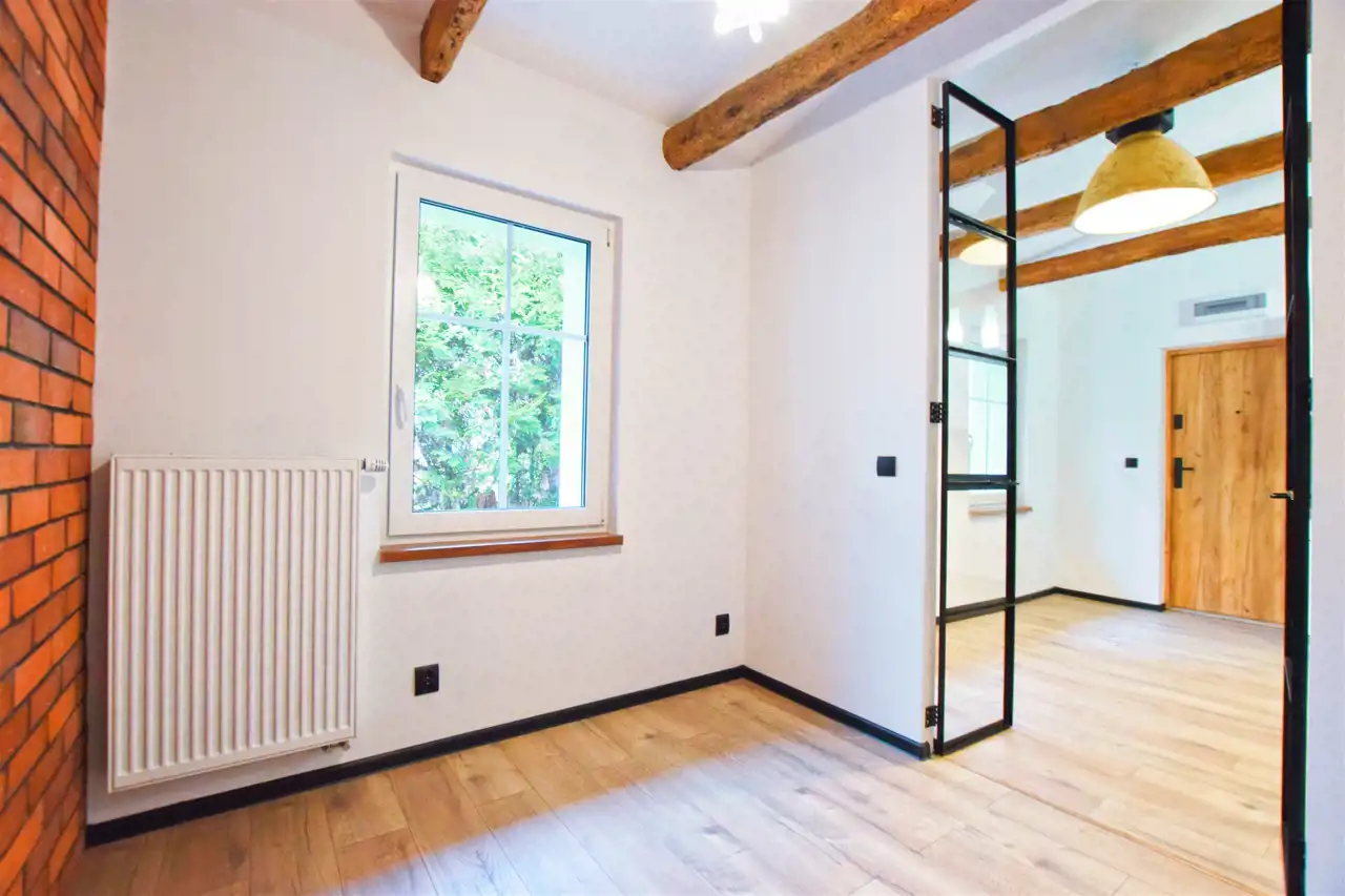 Mieszkanie utrzymane w spójnej stylistyce o charakterze industrialnym. Salon z aneksem kuchennym zachwyca asymetrycznym sufitem z dekoracyjnymi belkami oraz dopasowanym oświetleniem. Ponadto uwagę przyciągają rozpościerające się po sam sufit przeszkolone dwuskrzydłowe drzwi do sypialni.