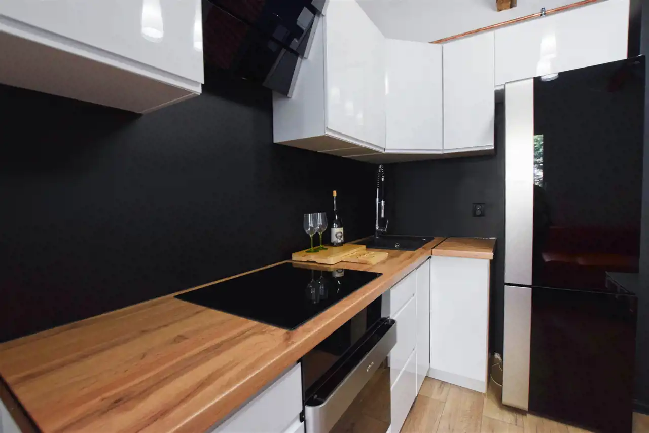 W cenie: aneks kuchenny z AGD (piekarnik, okap, płyta indukcyjna), armatura łazienkowa.