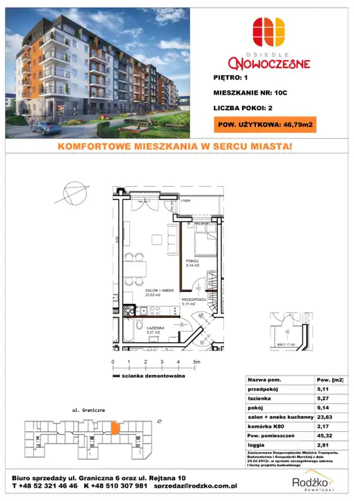 - Charakterystyka mieszkania 46.79 m2, 2 pokoje