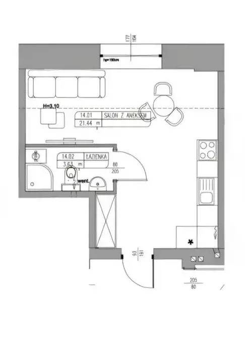- jasnego pokoju dziennego z aneksem kuchennym o pow. 21,44m2