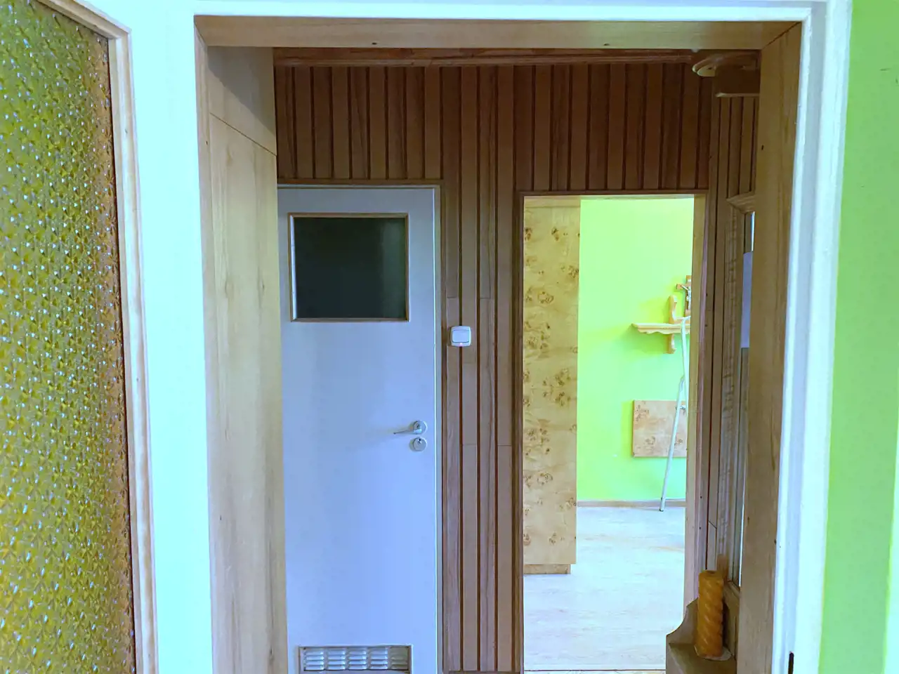 Okna PCV, na podłogach parkiet i terakota.
