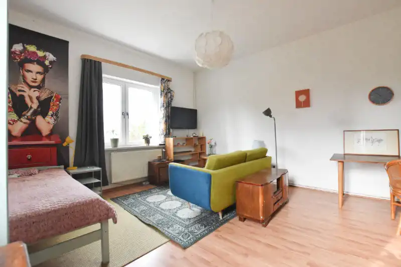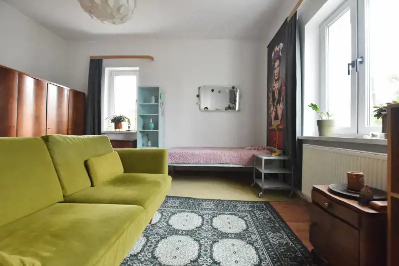 Właściwie opis powinien po prostu brzmieć: mieszkanie bez wad. Ustawny duży pokój, dobrze doświetlony, z wydzielonymi strefami i miejscem i do pracy i stół do podejmowania gości i szafy i sofą i łóżkiem:) Od wielu lat bezproblemowo wynajmowane. A to za sprawą i lokalizacji i komfortu użytkowania. Spokojna okolica, ale nie odludzie;) swobodna miejsc parkingowych. Zawiązana Wspólnota Mieszkaniowa 5-lokalowa, teren dookoła zadbany. Założony domofon, wszystko jak w bloku lecz taniej i ciszej i wygodniej. Opłaty według liczników (ogrzewanie piec dwufunkcyjny! idealne rozwiązanie przy tym metrażu) jedyną słuszną stałą opłatą jest fundusz remontowy w wysokości 150 zł. Wyposażenie mieszkania może zostać w całości lub do uzgodnienia. Obecny właściciel ma portugalską duszę, której część zostawił w tym mieszkaniu, zapraszam, by się o tym przekonać