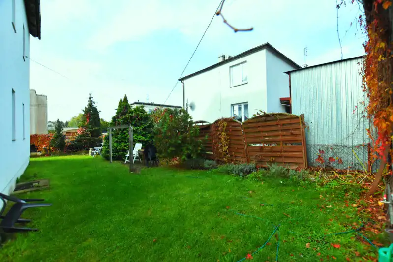 Budynek wielorodzinny dwukondygnacyjny na zamkniętej działce zagospodarowanej zielenią.