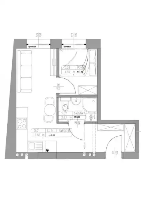 - oddzielnej sypialni o pow. 4,89m2