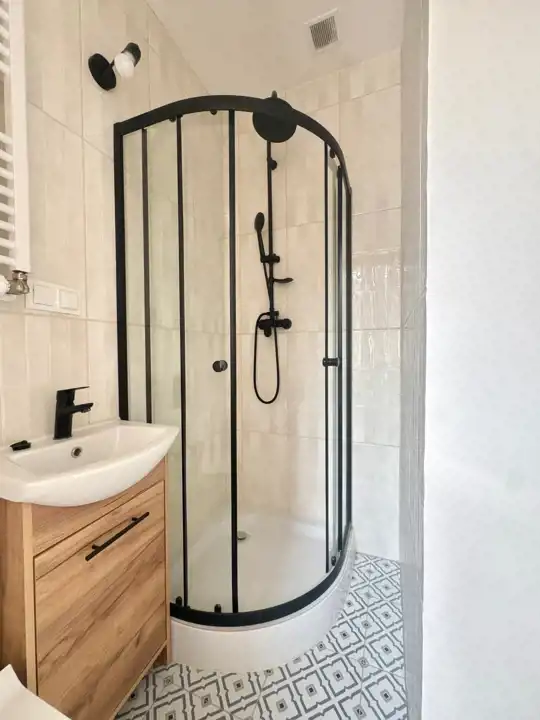 W łazience zamontowano kabinę prysznicową z deszczownicą, podwieszane wc, umywalkę z szafką oraz lustro. Nowoczesne płytki w modnych kolorach powodują, iż łazienka jest miła i przytulna.