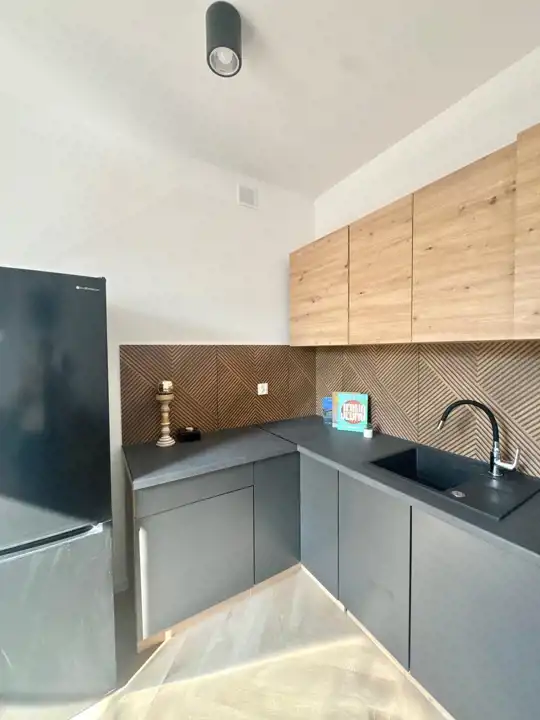 Gustownie urządzone mieszkanie tworzy spójną przestrzeń. Funkcjonalna kuchnia z dużą ilością szafek, sprzętem AGD( zmywarka, lodówka-zamrażarka). Salon z wygodną kanapą dają poczucie komfortu oraz przestrzeni. W sypialni znajduje się duże wygodne łóżko.