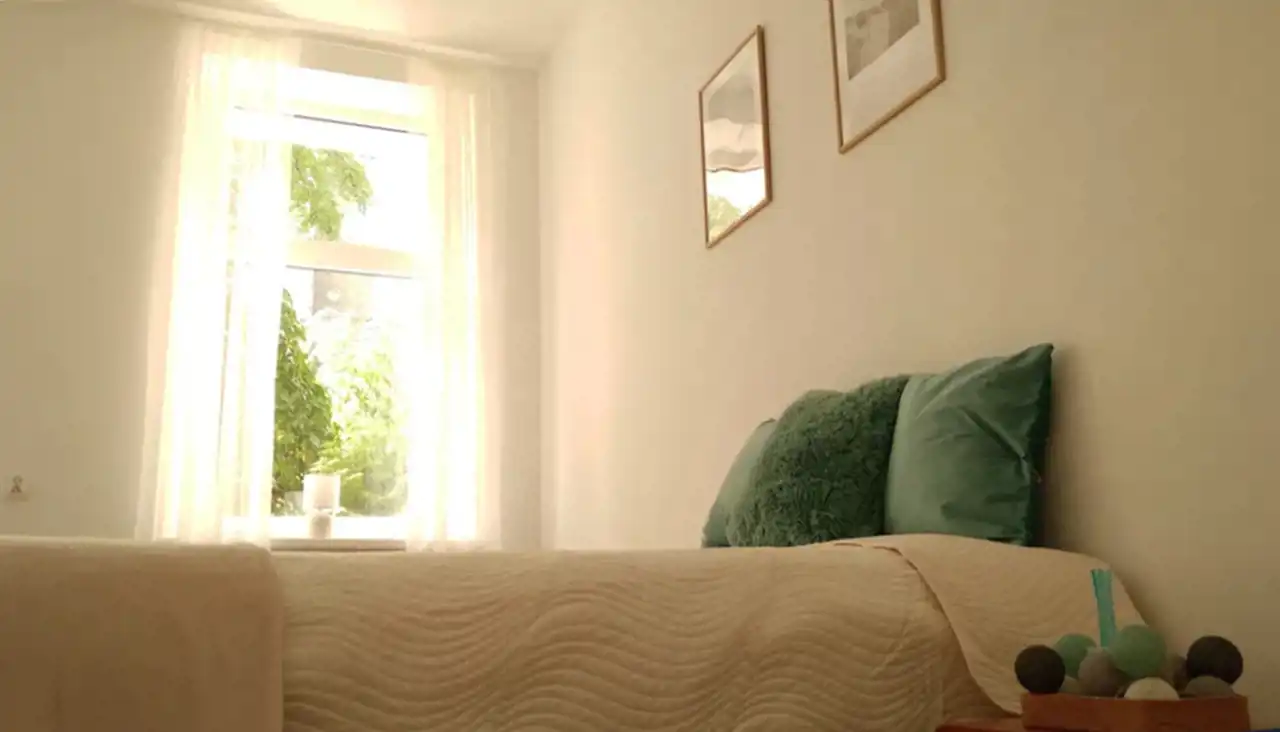 jasnego pokoju pełniącego funkcję salonu i sypialni,