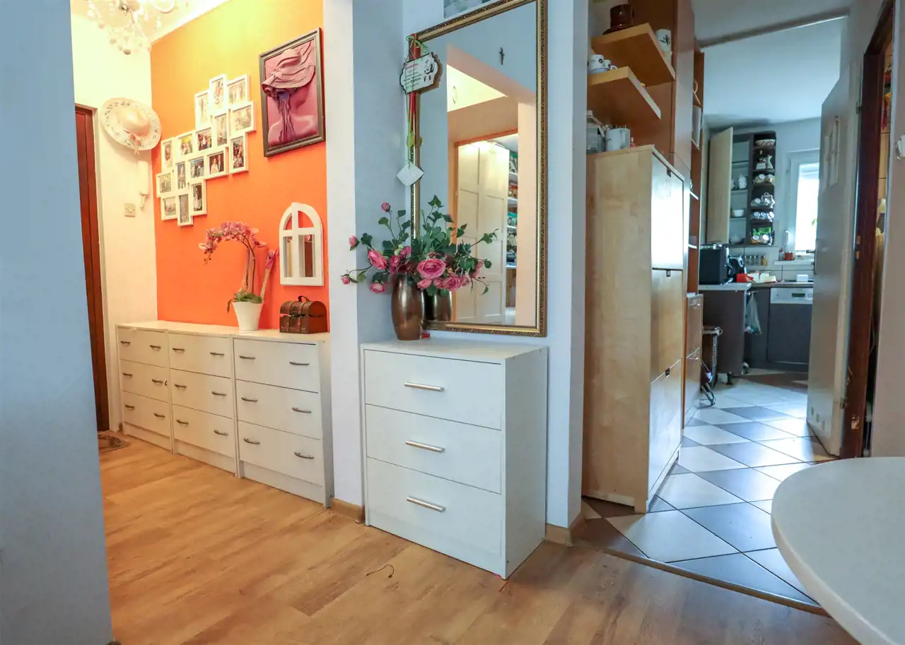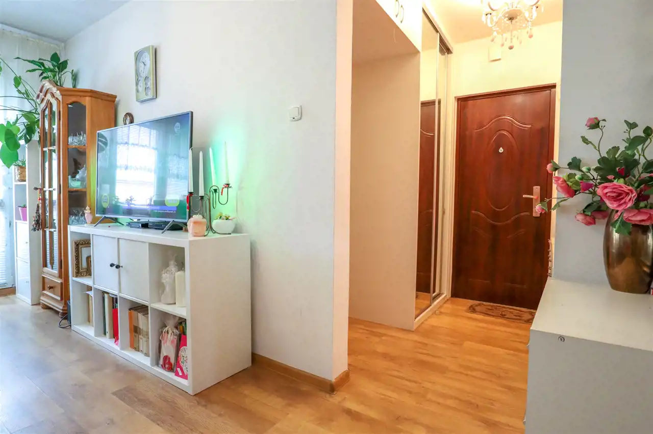 przedpokój (3,4m2) z zabudowaną, przeszkolą szafą