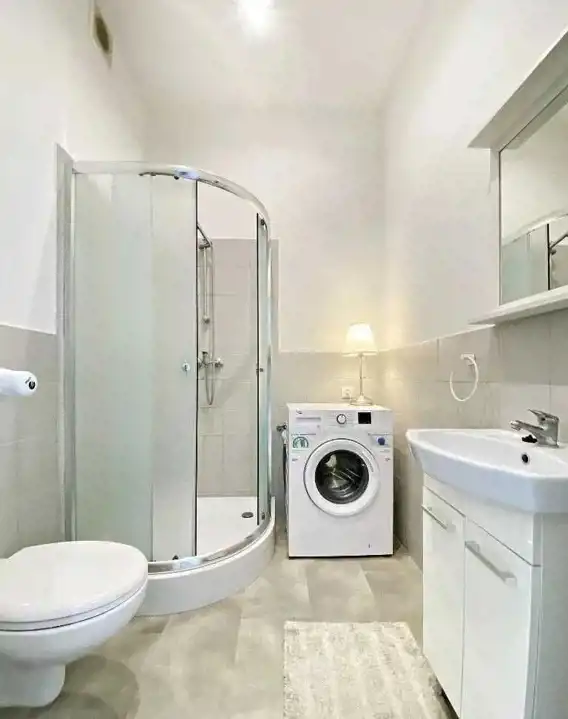 Łazienka w nowoczesnym wykończeniu, z prysznicem i pralką.