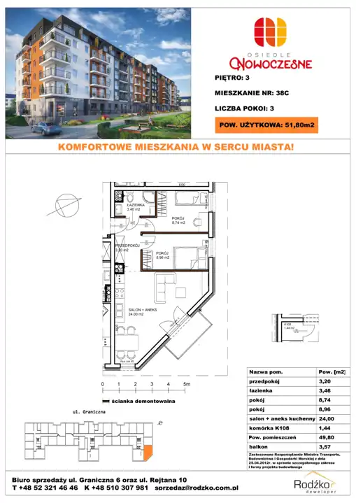 - Charakterystyka mieszkania 51.8 m2, 3 pokoje