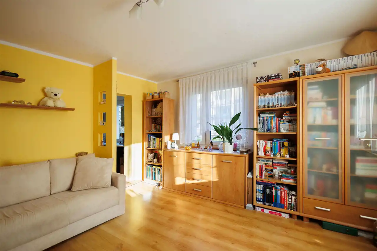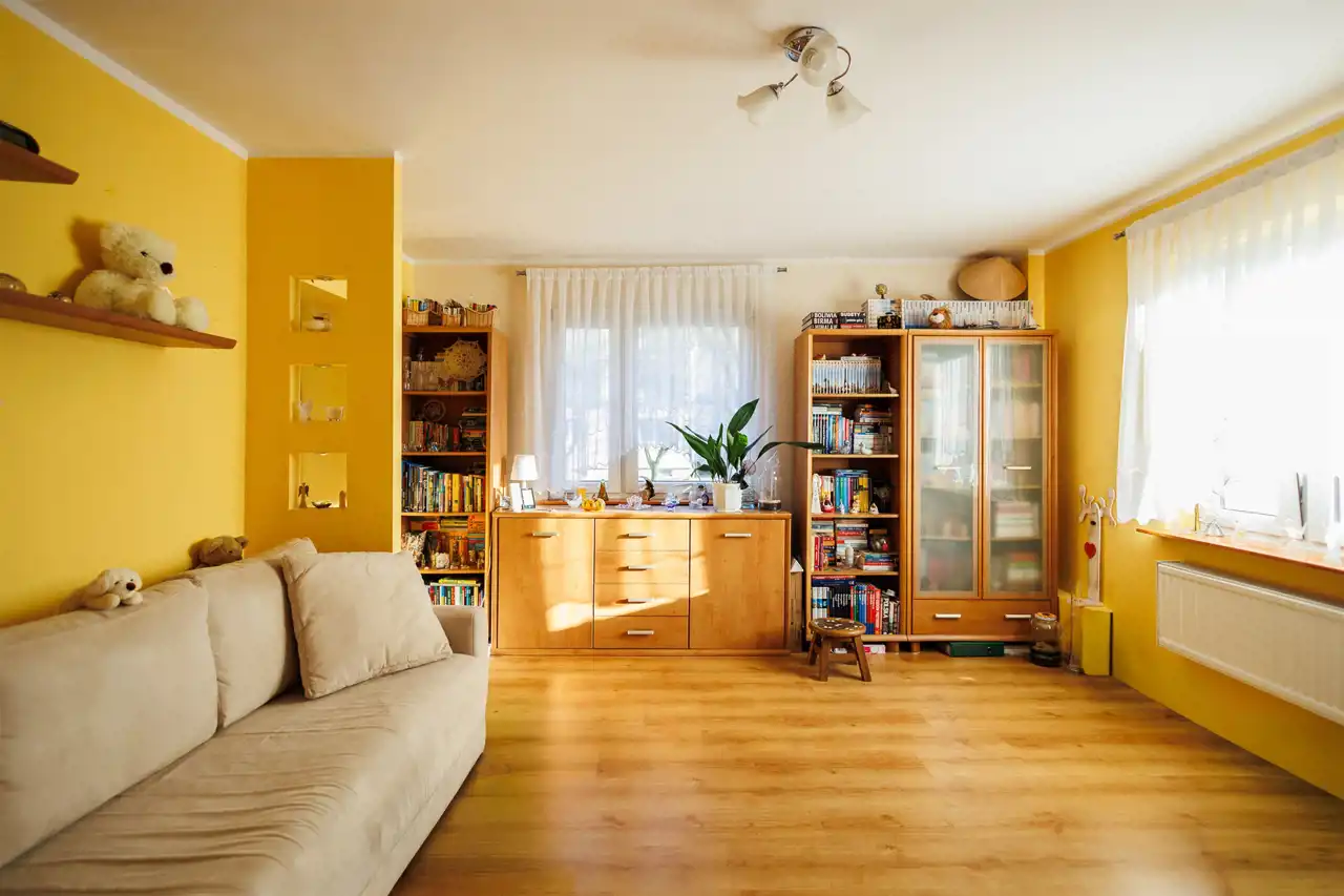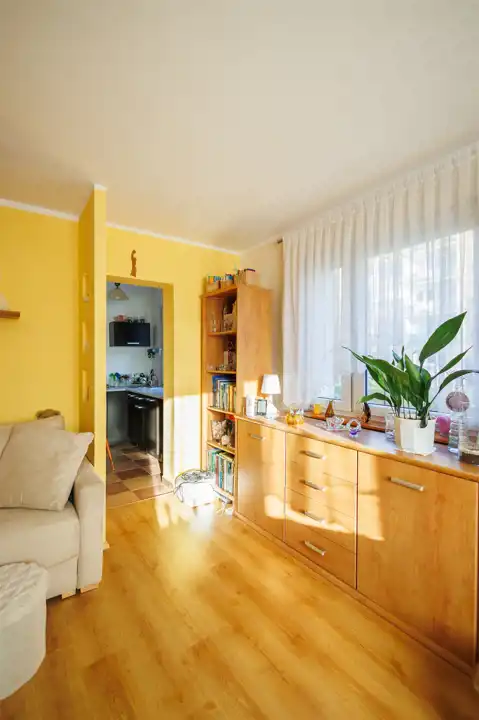 - Salon (21 m²): Z pięknymi panelami i gładziami na ścianach. W cenie otrzymujesz wygodną kanapę wykonaną na wymiar – idealną do relaksu po pracy.