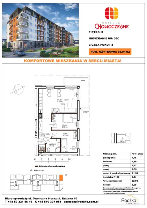 - Charakterystyka mieszkania 55.04 m2, 3 pokoje