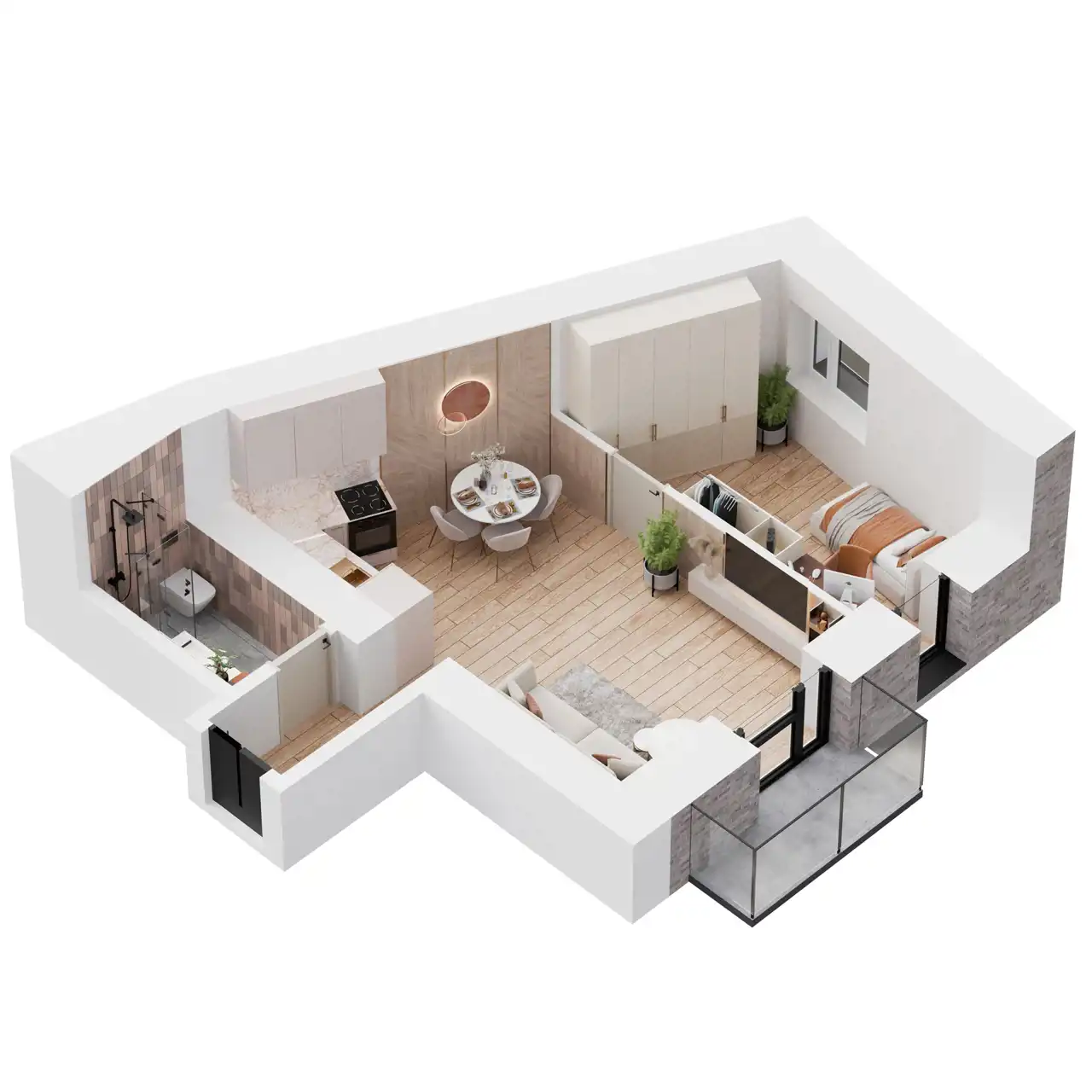 Układ składa się z salonu z kuchnią, sypialni i łazienki.