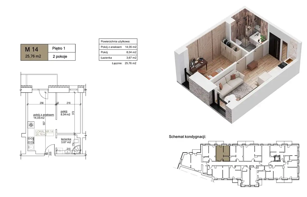 Prezentowane mieszkanie ma 25,76 m2 i znajduje się na 1. piętrze.