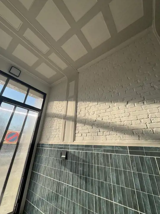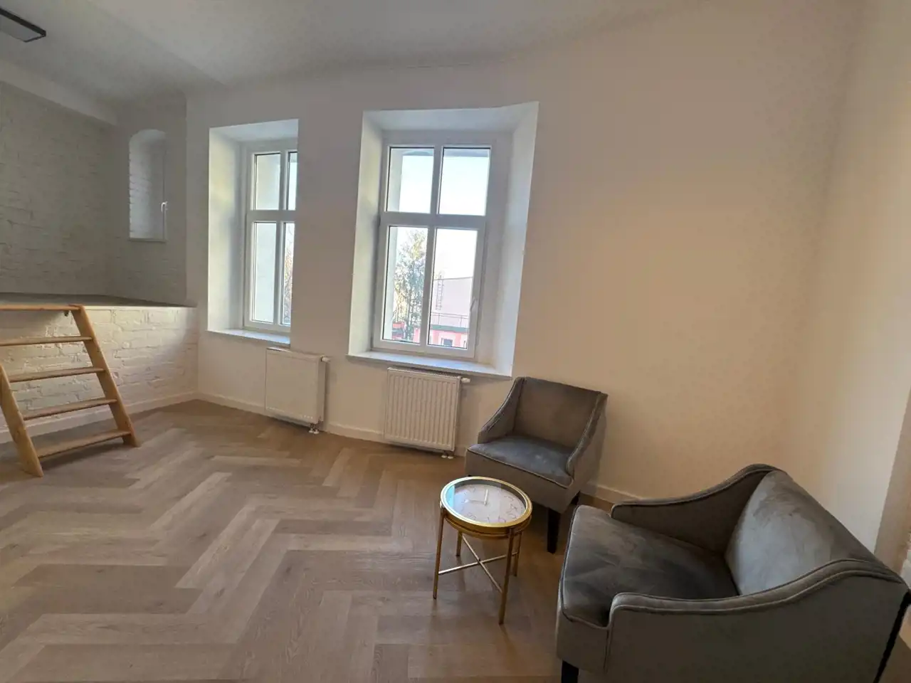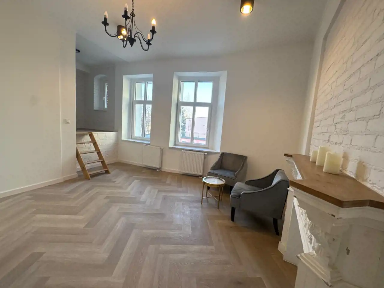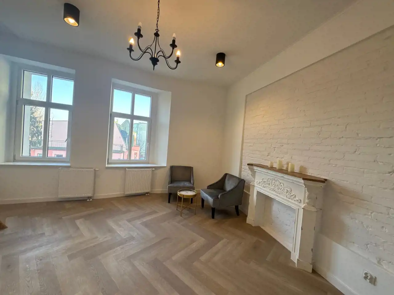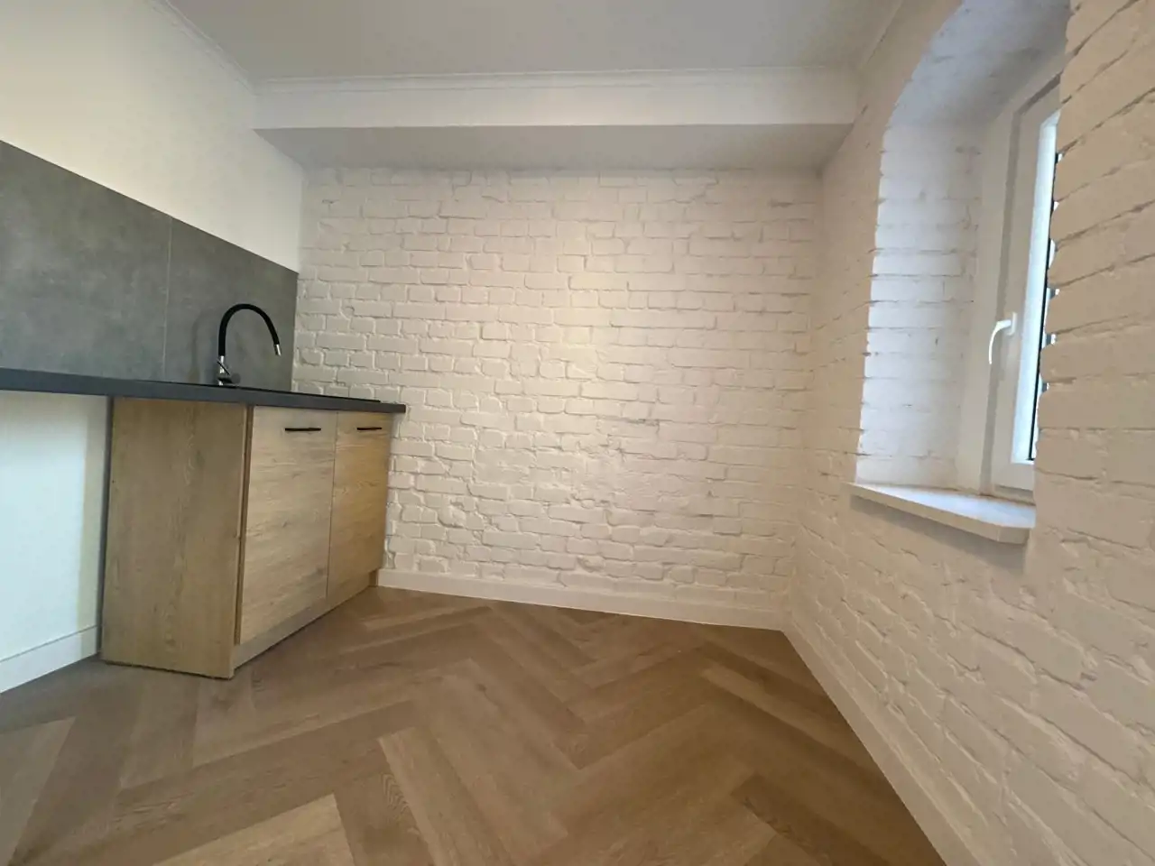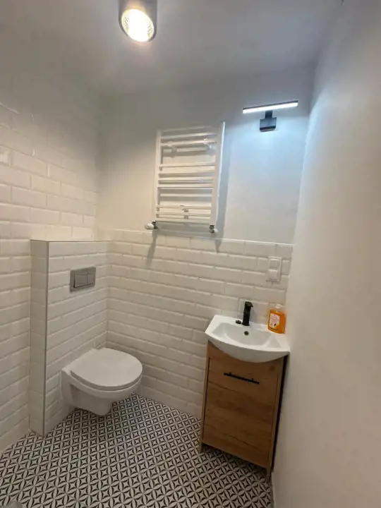 Funkcjonalnie zaprojektowane wnętrze tworzy miłą i przytulną atmosferę. Duże okna nadają charakteru, oraz dają dużo światła. Piękne podłogi ułożone w jodełkę dodają stylowego klimatu. W łazience zamontowano podwieszane wc, umywalkę z szafką. Nowoczesne płytki w modnych kolorach powodują, iż łazienka jest miła i przytulna.
